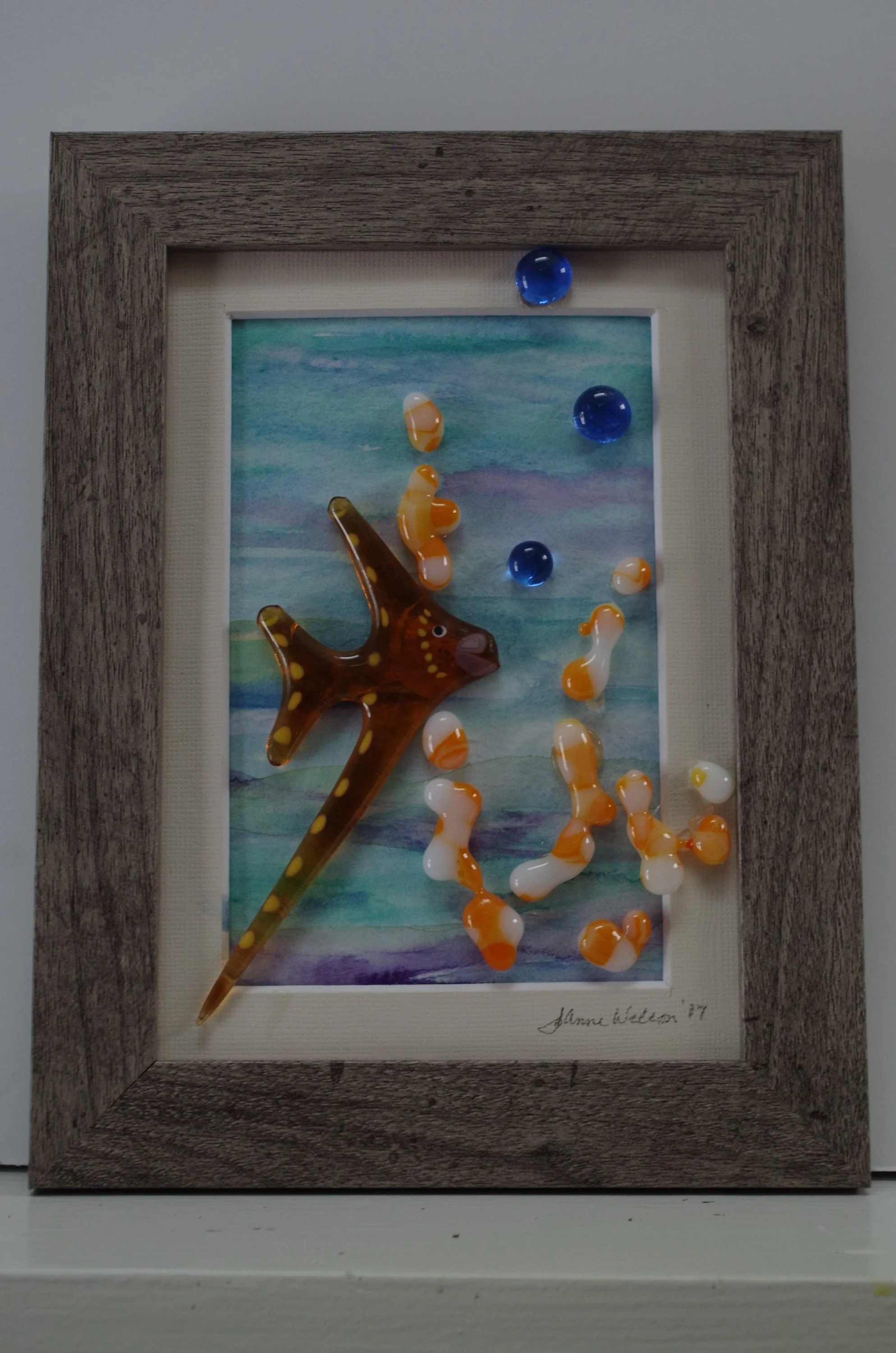 Though fused with care and fully annealed, all work is glass and can break under severe circumstances. Please note the shadow box frame is not hand made. Art may be removed easily and popped into another shadow box frame if desired.