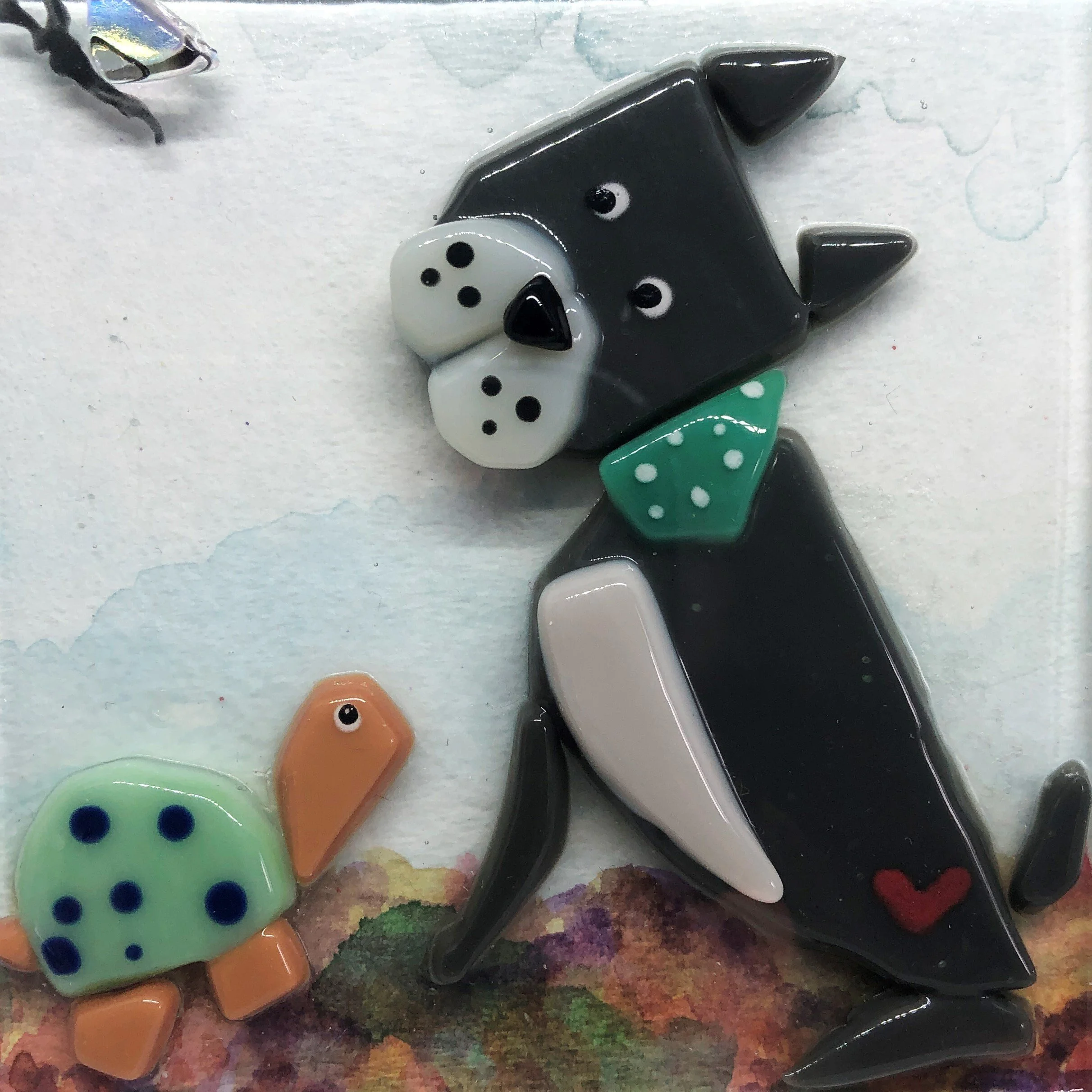 Mixed Medium Fused Glass and Watercolor original art. Dog, turtle and the butterfly. Shadowbox. Pit bull, Terrier. Boxer. Mixed Breed